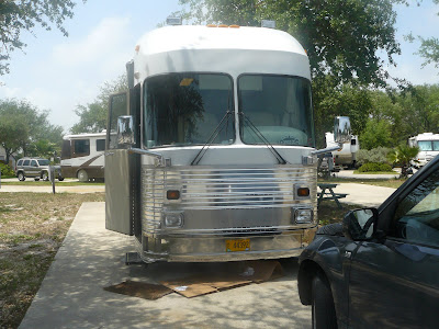 Here is the Sassy, sniffing all the good smells at the Park we stayed at in Robstown, nice park, and we were told that in the winter,(Jan.,Feb.,Mar.) the park is full, and it is $475 a month, that doesn't include electricity, YIKES!!! But it had a beautiful inside pool,Hot tub,as well as free bikes you could borrow if you don't own one, to ride around the park. They have something going on almost every day of the week, and the best part, it is just off the bay that leads to the Gulf of Mexico, and it is Beautiful. We found it in our book, and because of all the "Stuff" I told Bill I bet it was at least $40. a night, turned out it was only $25, nice surprise!!!